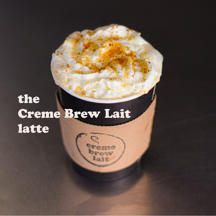 The Creme Brew Lait – a latte with white chocolate, vanilla, and a secret creme brulee flavored ingredient. Topped with whipped cream, nutmeg and raw sugar.